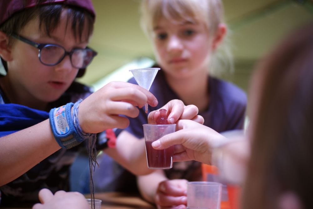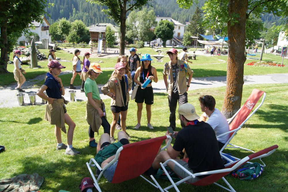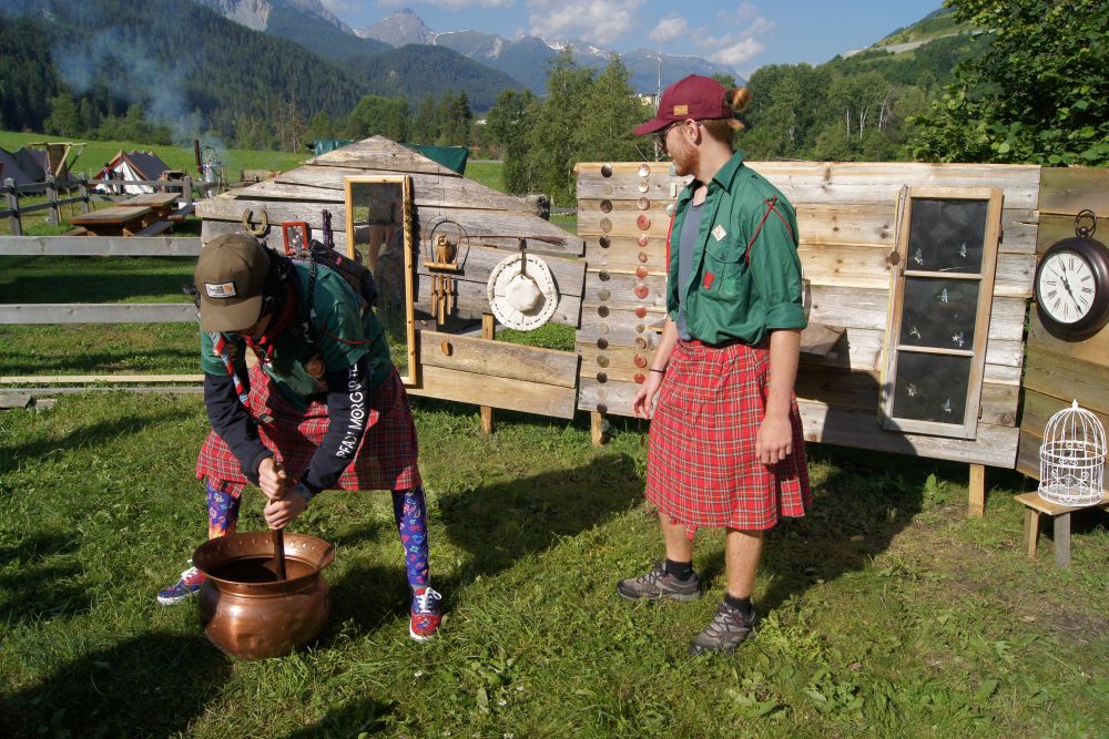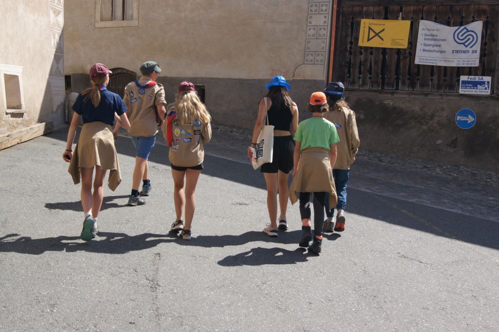 Nach dem Frühstück stellte die Pfadistufe fest, dass die Wölfe in der Nacht auch ihr magisches Zauberwasser benutzt hatten, um den Lagerplatz zu retten. Daher machten sich die Pfadis am Morgen auf die Suche nach dem natürlichen Quellwasser (rotes Mineralwasser aus den Scuoler Brunnen), das uns hilft, unsere Kräfte besser zu verstehen. Bei einem Orientierungslauf durch Scuol lernten wir die Umgebung besser kennen.
